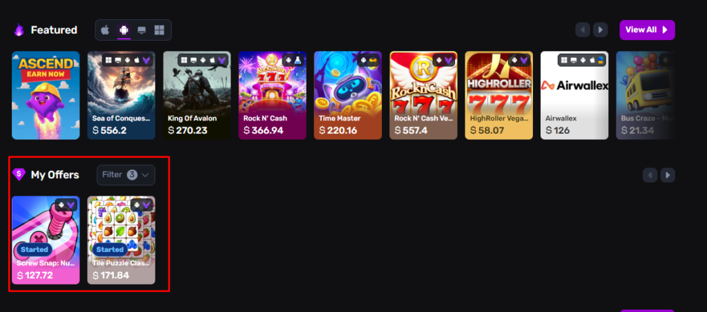 這裡就是列出平台中可以賺錢的項目,現在比較好的平台介面就設計成讓你可以很快找到匹配任務,Fast Offers,Survey,Offer Walls