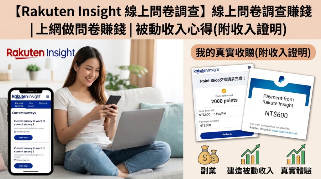 Rakuten Insight 是日本樂天旗下知名線上問卷平台,台灣可直接兌換郵局現金或樂天點數,非常適合新手入門網賺。