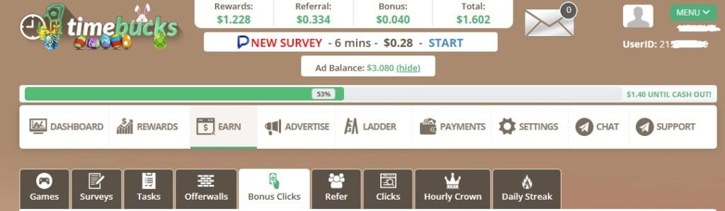 Bonus Clicks 提供每2小時額外的點擊獎勵,讓用戶在完成基本點擊任務後,還能再獲得額外收入。